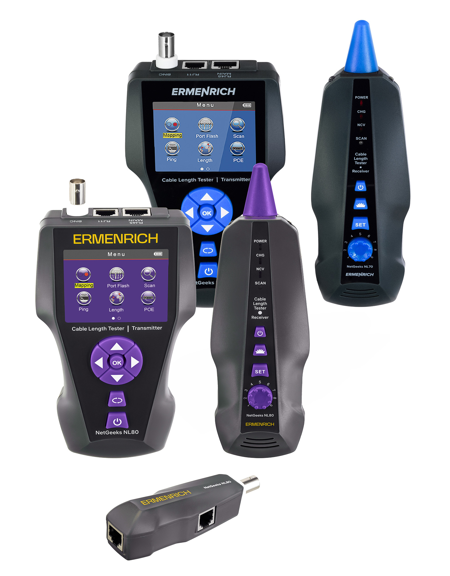 Az Ermenrich NetGeeks NL80 kábelhossz tesztelő akár 1000 méterig képes kábelhosszúságot mérni, emellett pedig más funkciókat is kínál. Áramkörszakadás, rövidzárlat, valamint osztott, keresztezett és fordított érpár is kereshető vele. Továbbá megmérhető vele az áramkörszakadástól vagy rövidzárlattól számított távolság. Az Ermenrich NetGeeks NL80 eszköz képes követni a kábeleket, észlelni például egy routerhez vagy switch-hez csatlakoztatott kábelt, PoE és PING teszteket végezni, valamint elmenteni az eredményeket egy memóriakártyára.