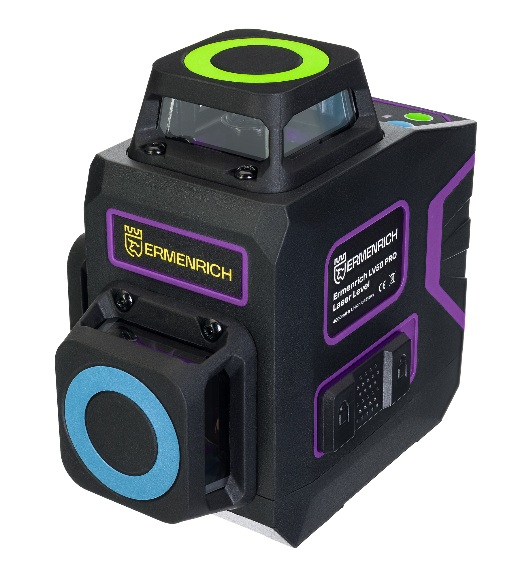 Az Ermenrich PRO LV50 lézeres szintező egy rezgéseket csillapító kompenzátorral van ellátva, így a készülék automatikusan beállítja a lézer síkját. A legmagasabb szintű pontosság eléréséhez használhatja a készletben mellékelt céltáblát (lézersugárvevő). A beépített lítium akkumulátor hosszú üzemidőt biztosít, míg a távirányító elemekkel működik. A lézer fényereje négy fokozatban állítható, így bármilyen fényviszony esetén kiválaszthatja az optimális beállítást. A lézeres szintező széles hőmérséklet-tartományban, akár fagypont alatti hőmérsékleteken is használható, emellett porral és fröccsenő vízzel szemben ellenálló.