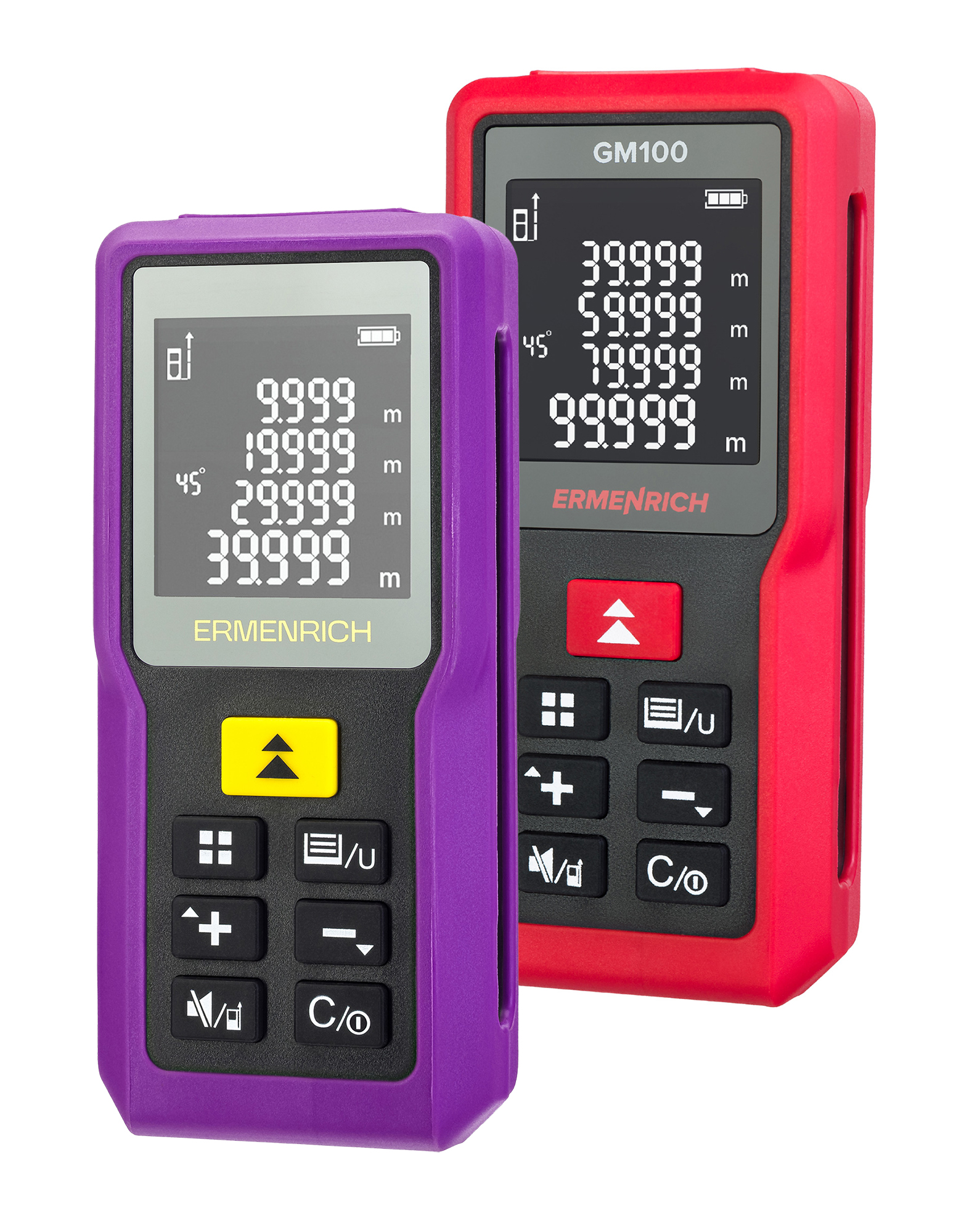 Az Ermenrich Reel PRO GM100 építési és felújítási helyszíneken végzett mérésekhez tervezett lézeres mérőműszer. Telekhatár-felmérésekhez, földmérési munkákhoz és más olyan alkalmazásokhoz is használható, ahol az objektum lineáris méretének, területének és térfogatának pontos mérésére van szükség. A legnagyobb mérhető távolság 100 méter. A lézeres mérő lézeres szögmérőként is használható. A Pitagorasz-tétel funkciónak köszönhetően automatikusan kiszámítja a távolságokat a közbenső mérések után. Ez a funkció különösen akkor hasznos, ha a lézert nem lehet közvetlenül a két pont közé kihúzva elhelyezni.