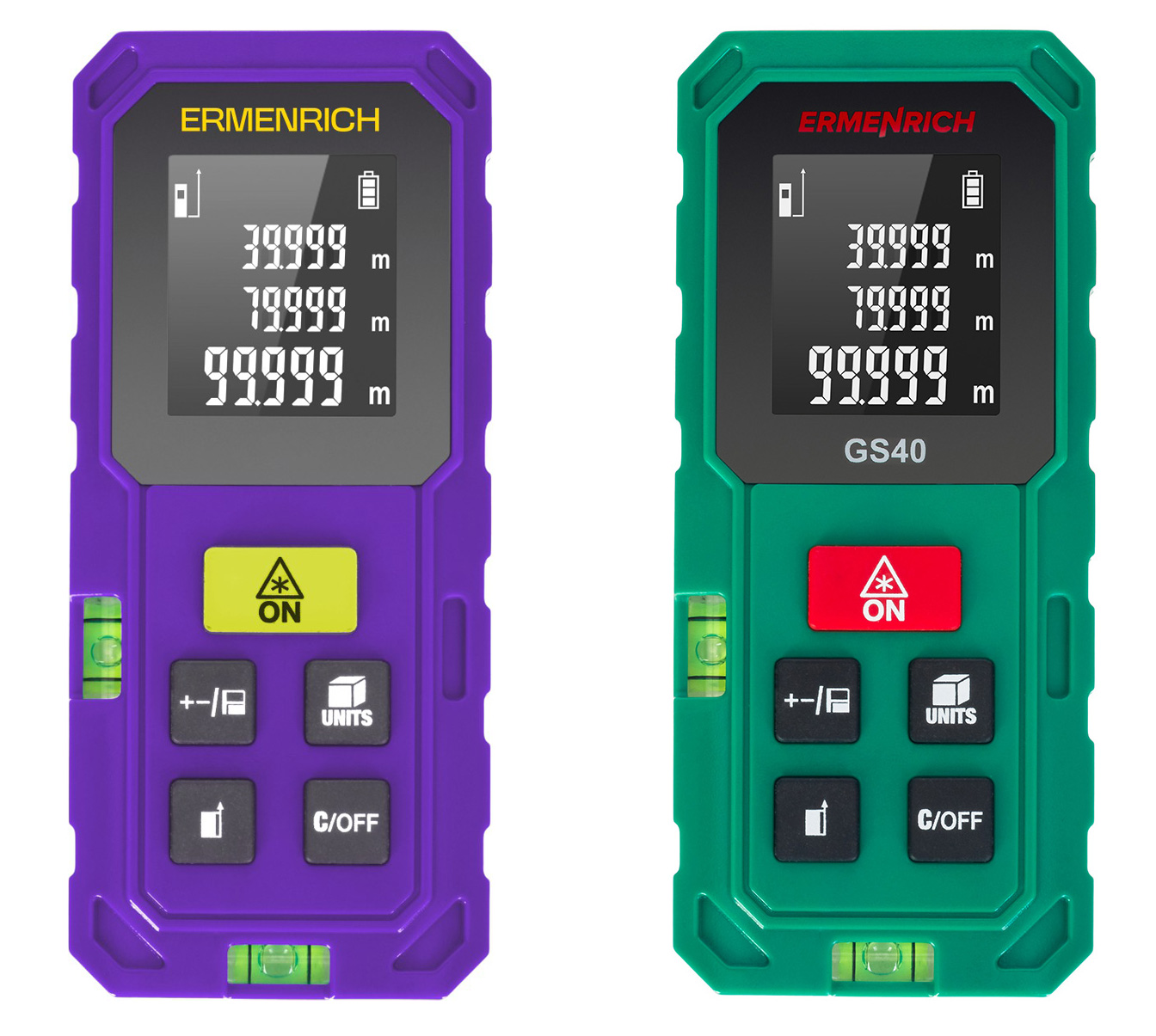 Két vízmértékkel. Távolságok, terület és térfogat mérésére. Pitagorasz-tétel funkció. Mérési távolság: akár 40 méter